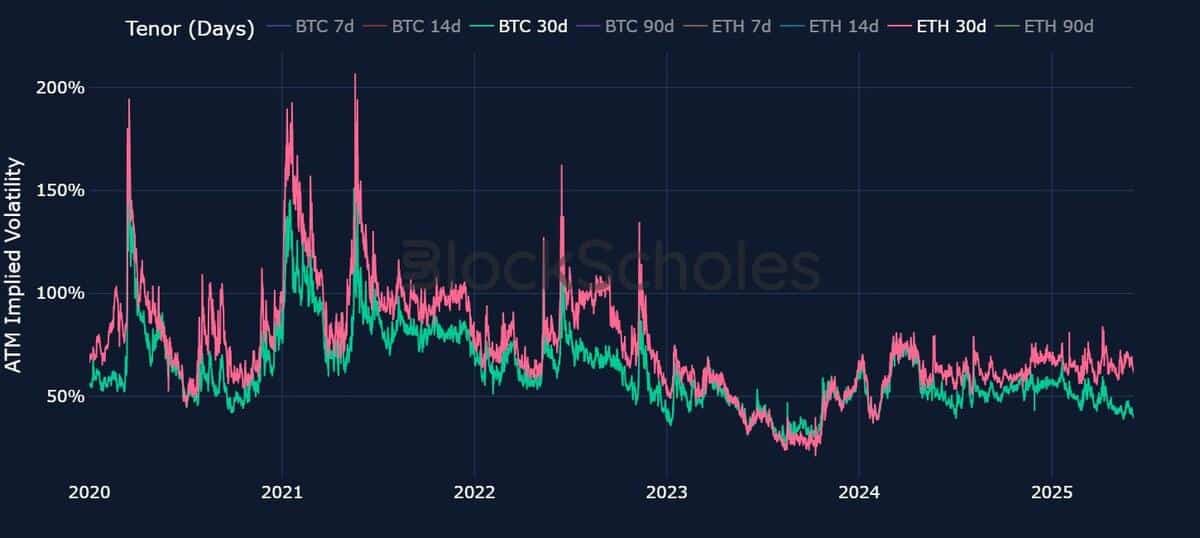 - In May 2025, ETH options exhibited historically high volatility premiums over BTC, driven by ETH’s elevated realized volatility during a major price rally.