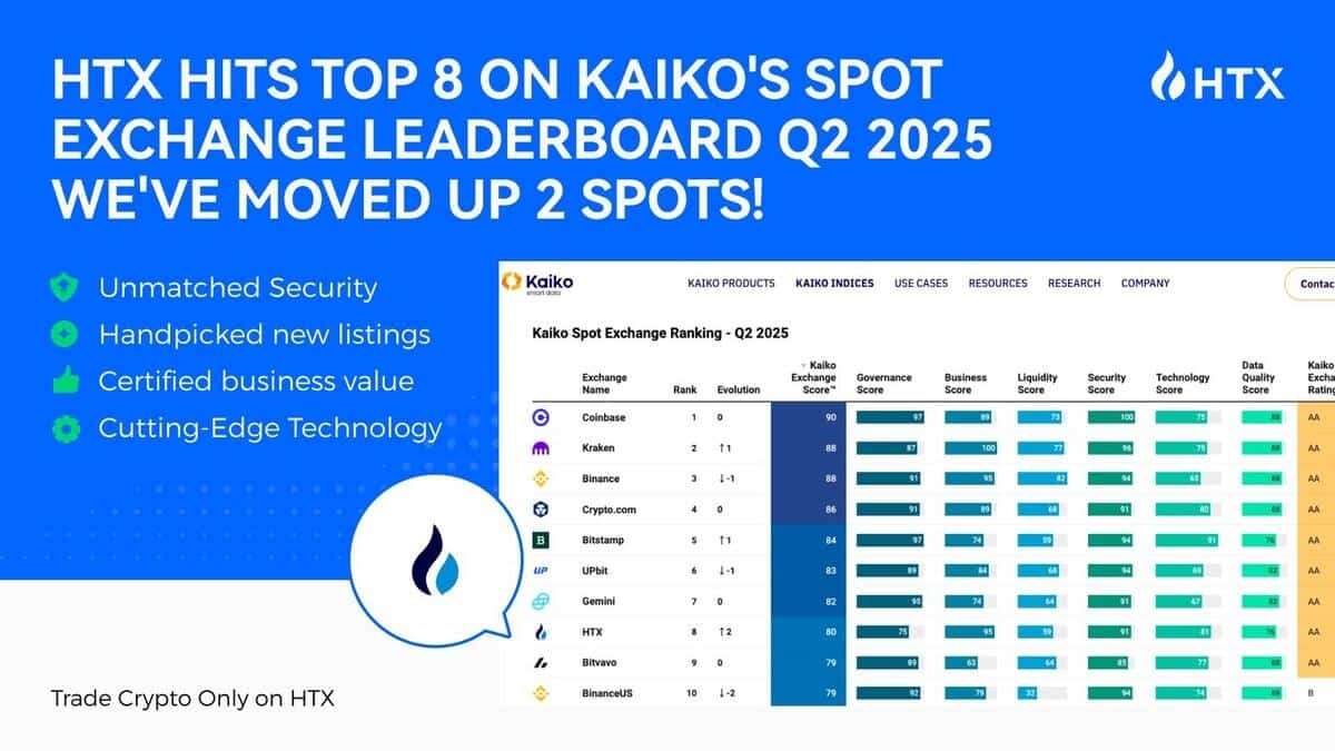 SINGAPORE, June 5, 2025 /PRNewswire/ — HTX, a leading global cryptocurrency exchange, has officially ranked 8th in Kaiko’s Q2 2025 Global Spot Exchange Ranking, rising two positions from the previous quarter. This significant leap marks the strongest upward movement among the top 10 exchanges this quarter and underscores HTX’s growing global influence and robust platform performance.